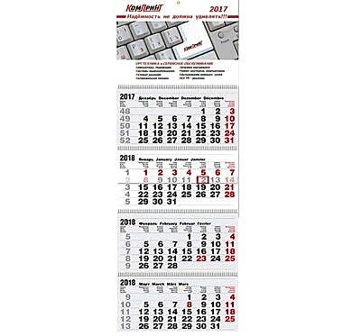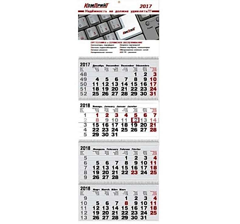 Календарь с четырьмя раздельными блоками на 4-х пружинах оригинальный формат для тех кому не хватает одновременного отображения трех месяцев, добавлен четвертый месяц. Благодаря своей длине в развернутом виде, календарь «Quattro» заметно выделяется на фоне других квартальных Pin-Up В сложенном состоянии его размер в 5 раз! меньше, чем в развернутом. Помимо верхнего постера с рекламной, фирменные календари "Quattro" могут иметь персонализированные подложки блоков.